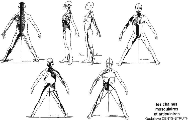 Le corps forme une unité dont toutes les parties interdépendantes sont reliées entre elles par mes muscles et leurs enveloppes organisés en chaîne. Ces chaînes musculaires mobilisent des chaînes articulaires pour les modeler en formes individuelles révélatrices de nos points forts comme de nos fragilités. Nos tensions, nos émotions, nos sentiments, notre manière d’être dans un environnement, notre vécu, s’expriment au travers de ce système musculaire et influencent nos gestes et postures. Quand ces familles musculaires sont souples et accordées, elles assurent notre adaptabilité aux soucis de la vie. Lorsque de telles tensions ou des attitudes se répètent et se prolongent dans le temps, un excès de tonus musculaire s’installe et gagne de proche en proche, des muscles bien spécifiques jusqu’à faire apparaître sur le corps de véritables bandes tensionnelles qui créent des formes figées.